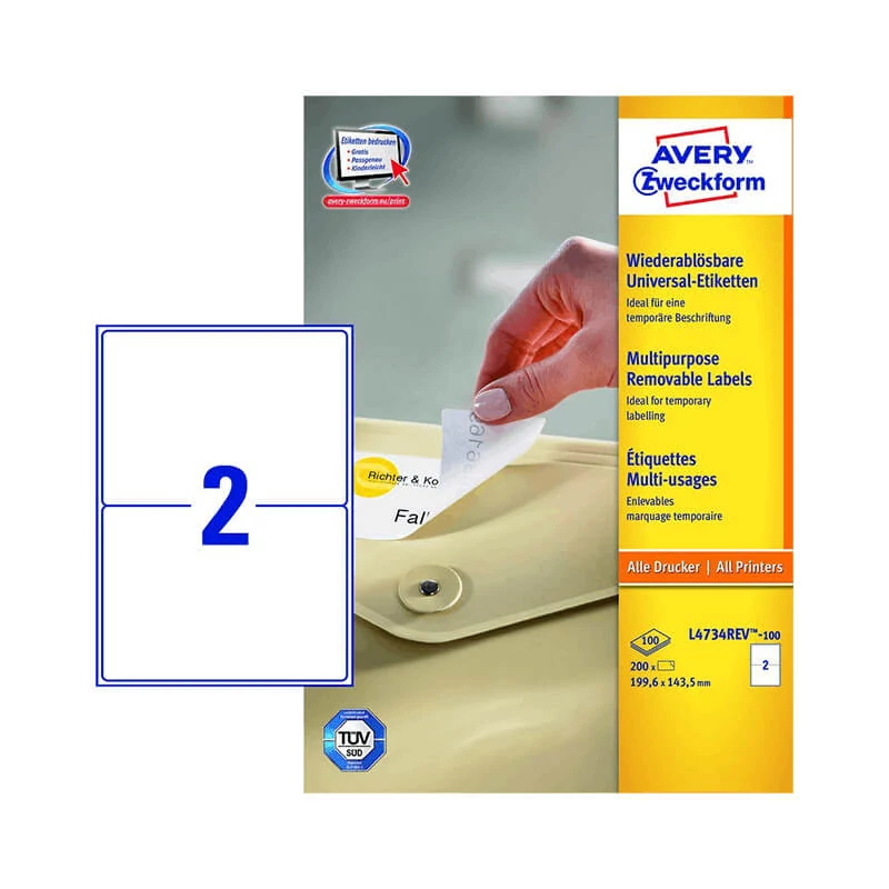 A L4734REV-100 cikkszámú Avery Zweckform öntapadós etikett címke megbízhatóságának és minőségének köszönhetően több országban is piacvezető termék. A különbőző kiszerelésnek köszönhetően (10, 25, 50, 100 ív/csomag) kis mennyiségű otthoni felhasználásra és nagyobb lélegzetvételű vállalati munkákhoz is kiváló választás. Az Avery Zweckform a gyártási technológiák fejlesztése során kiemelt figyelmet fordít az otthoni/irodai nyomtatók védelmére, így egészen biztos nem kell ragasztó kifolyástól/maradványoktól tartania, melyek rátapadhatnak a címkékek nyomtatása során a készülék alkatrészeire, ami meghibásodáshoz vezethet.