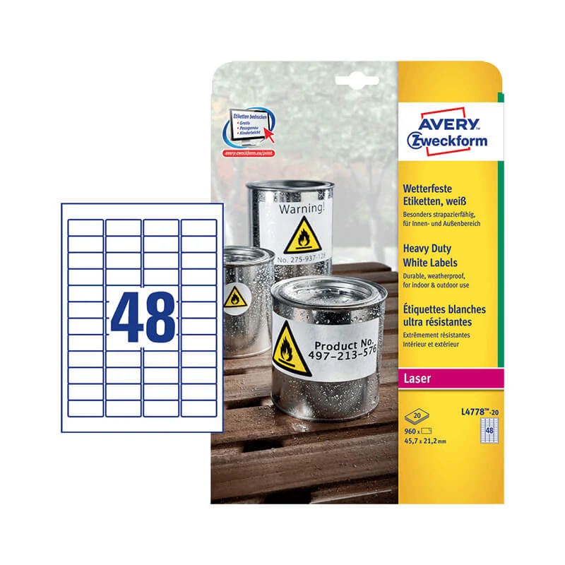 A L4778-20 cikkszámú Avery Zweckform öntapadós etikett címke megbízhatóságának és minőségének köszönhetően több országban is piacvezető termék. A különbőző kiszerelésnek köszönhetően (10, 25, 50, 100 ív/csomag) kis mennyiségű otthoni felhasználásra és nagyobb lélegzetvételű vállalati munkákhoz is kiváló választás. Az Avery Zweckform a gyártási technológiák fejlesztése során kiemelt figyelmet fordít az otthoni/irodai nyomtatók védelmére, így egészen biztos nem kell ragasztó kifolyástól/maradványoktól tartania, melyek rátapadhatnak a címkékek nyomtatása során a készülék alkatrészeire, ami meghibásodáshoz vezethet.