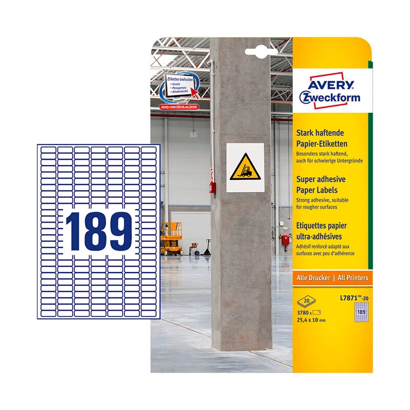 A L7871-20 cikkszámú Avery Zweckform öntapadós etikett címke megbízhatóságának és minőségének köszönhetően több országban is piacvezető termék. A különbőző kiszerelésnek köszönhetően (10, 25, 50, 100 ív/csomag) kis mennyiségű otthoni felhasználásra és nagyobb lélegzetvételű vállalati munkákhoz is kiváló választás. Az Avery Zweckform a gyártási technológiák fejlesztése során kiemelt figyelmet fordít az otthoni/irodai nyomtatók védelmére, így egészen biztos nem kell ragasztó kifolyástól/maradványoktól tartania, melyek rátapadhatnak a címkékek nyomtatása során a készülék alkatrészeire, ami meghibásodáshoz vezethet.