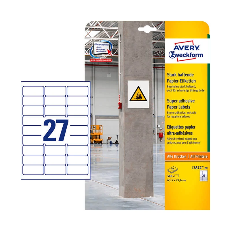A L7874-20 cikkszámú Avery Zweckform öntapadós etikett címke megbízhatóságának és minőségének köszönhetően több országban is piacvezető termék. A különbőző kiszerelésnek köszönhetően (10, 25, 50, 100 ív/csomag) kis mennyiségű otthoni felhasználásra és nagyobb lélegzetvételű vállalati munkákhoz is kiváló választás. Az Avery Zweckform a gyártási technológiák fejlesztése során kiemelt figyelmet fordít az otthoni/irodai nyomtatók védelmére, így egészen biztos nem kell ragasztó kifolyástól/maradványoktól tartania, melyek rátapadhatnak a címkékek nyomtatása során a készülék alkatrészeire, ami meghibásodáshoz vezethet.