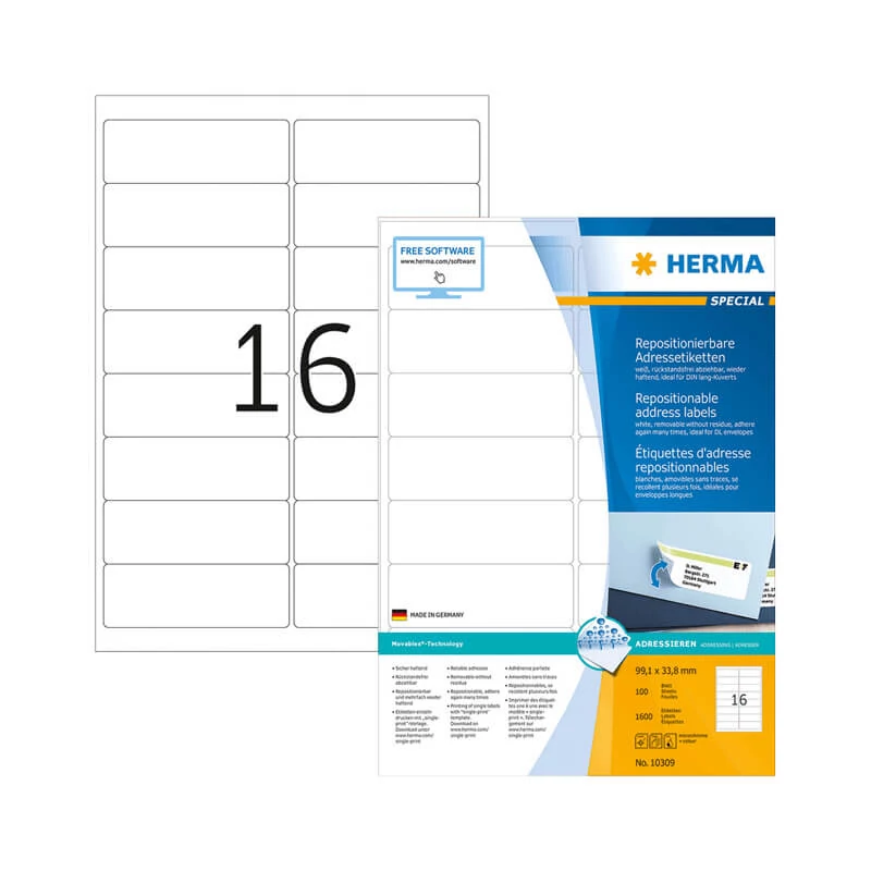 A HERMA 10309 cikkszámú Herma öntapadós etikett címke megbízhatóságának és minőségének köszönhetően több országban is piacvezető termék. A különbőző kiszerelésnek köszönhetően (10, 25, 50, 100 ív/csomag) kis mennyiségű otthoni felhasználásra és nagyobb lélegzetvételű vállalati munkákhoz is kiváló választás. A Herma gyártási technológiák fejlesztése során kiemelt figyelmet fordít az otthoni/irodai nyomtatók védelmére, így egészen biztos nem kell ragasztó kifolyástól/maradványoktól tartania, melyek rátapadhatnak a címkékek nyomtatása során a készülék alkatrészeire, ami meghibásodáshoz vezethet.