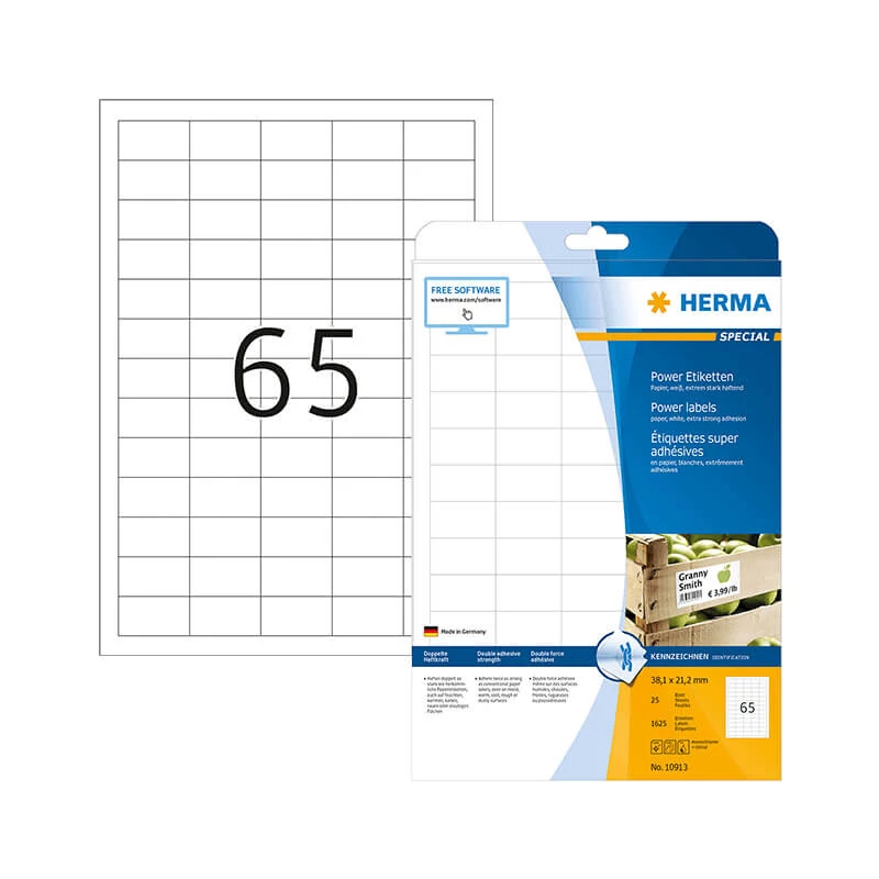 A HERMA 10913 cikkszámú Herma öntapadós etikett címke megbízhatóságának és minőségének köszönhetően több országban is piacvezető termék. A különbőző kiszerelésnek köszönhetően (10, 25, 50, 100 ív/csomag) kis mennyiségű otthoni felhasználásra és nagyobb lélegzetvételű vállalati munkákhoz is kiváló választás. A Herma gyártási technológiák fejlesztése során kiemelt figyelmet fordít az otthoni/irodai nyomtatók védelmére, így egészen biztos nem kell ragasztó kifolyástól/maradványoktól tartania, melyek rátapadhatnak a címkékek nyomtatása során a készülék alkatrészeire, ami meghibásodáshoz vezethet.