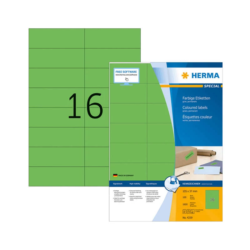 A HERMA 4259 cikkszámú Herma öntapadós etikett címke megbízhatóságának és minőségének köszönhetően több országban is piacvezető termék. A különbőző kiszerelésnek köszönhetően (10, 25, 50, 100 ív/csomag) kis mennyiségű otthoni felhasználásra és nagyobb lélegzetvételű vállalati munkákhoz is kiváló választás. A Herma gyártási technológiák fejlesztése során kiemelt figyelmet fordít az otthoni/irodai nyomtatók védelmére, így egészen biztos nem kell ragasztó kifolyástól/maradványoktól tartania, melyek rátapadhatnak a címkékek nyomtatása során a készülék alkatrészeire, ami meghibásodáshoz vezethet.