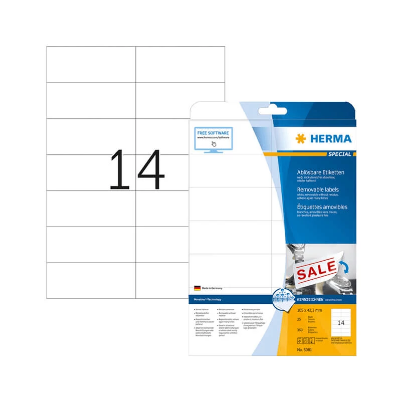 A HERMA 5081 cikkszámú Herma öntapadós etikett címke megbízhatóságának és minőségének köszönhetően több országban is piacvezető termék. A különbőző kiszerelésnek köszönhetően (10, 25, 50, 100 ív/csomag) kis mennyiségű otthoni felhasználásra és nagyobb lélegzetvételű vállalati munkákhoz is kiváló választás. A Herma gyártási technológiák fejlesztése során kiemelt figyelmet fordít az otthoni/irodai nyomtatók védelmére, így egészen biztos nem kell ragasztó kifolyástól/maradványoktól tartania, melyek rátapadhatnak a címkékek nyomtatása során a készülék alkatrészeire, ami meghibásodáshoz vezethet.