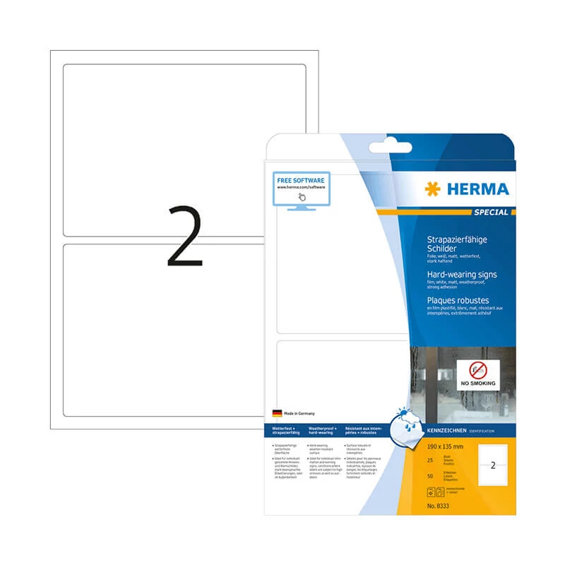 A HERMA 8333 cikkszámú Herma öntapadós etikett címke megbízhatóságának és minőségének köszönhetően több országban is piacvezető termék. A különbőző kiszerelésnek köszönhetően (10, 25, 50, 100 ív/csomag) kis mennyiségű otthoni felhasználásra és nagyobb lélegzetvételű vállalati munkákhoz is kiváló választás. A Herma gyártási technológiák fejlesztése során kiemelt figyelmet fordít az otthoni/irodai nyomtatók védelmére, így egészen biztos nem kell ragasztó kifolyástól/maradványoktól tartania, melyek rátapadhatnak a címkékek nyomtatása során a készülék alkatrészeire, ami meghibásodáshoz vezethet.