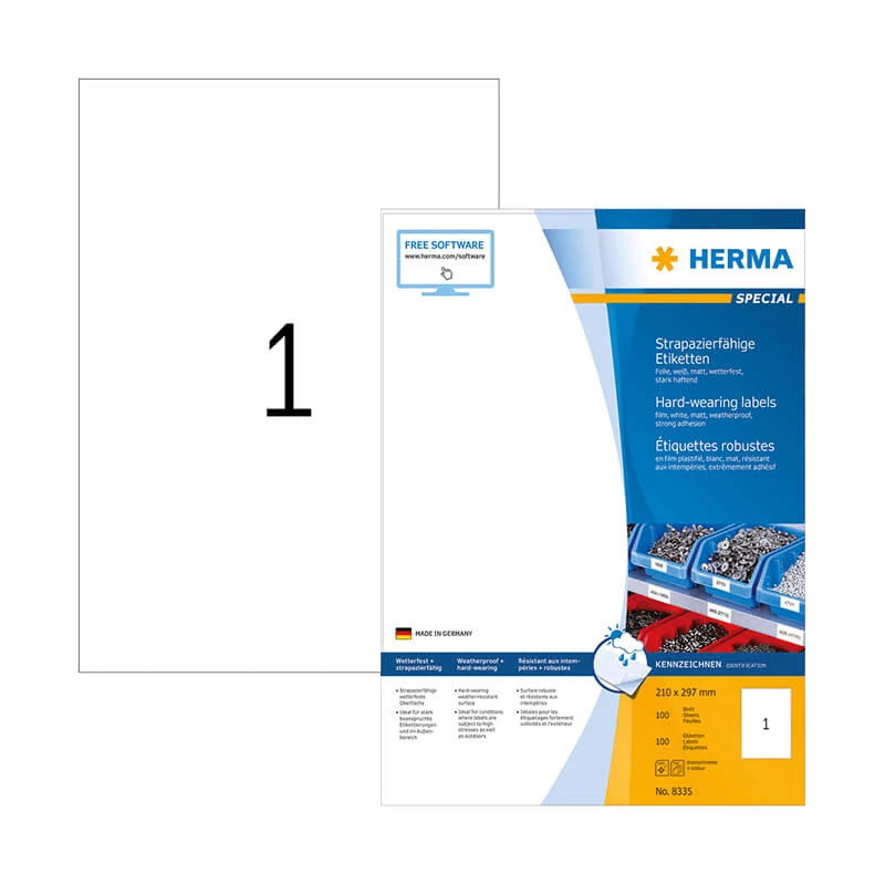 A HERMA 8335 cikkszámú Herma öntapadós etikett címke megbízhatóságának és minőségének köszönhetően több országban is piacvezető termék. A különbőző kiszerelésnek köszönhetően (10, 25, 50, 100 ív/csomag) kis mennyiségű otthoni felhasználásra és nagyobb lélegzetvételű vállalati munkákhoz is kiváló választás. A Herma gyártási technológiák fejlesztése során kiemelt figyelmet fordít az otthoni/irodai nyomtatók védelmére, így egészen biztos nem kell ragasztó kifolyástól/maradványoktól tartania, melyek rátapadhatnak a címkékek nyomtatása során a készülék alkatrészeire, ami meghibásodáshoz vezethet.