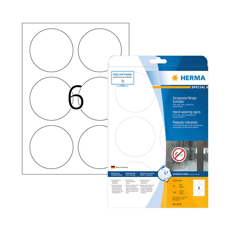 A HERMA 8336 cikkszámú Herma öntapadós etikett címke megbízhatóságának és minőségének köszönhetően több országban is piacvezető termék. A különbőző kiszerelésnek köszönhetően (10, 25, 50, 100 ív/csomag) kis mennyiségű otthoni felhasználásra és nagyobb lélegzetvételű vállalati munkákhoz is kiváló választás. A Herma gyártási technológiák fejlesztése során kiemelt figyelmet fordít az otthoni/irodai nyomtatók védelmére, így egészen biztos nem kell ragasztó kifolyástól/maradványoktól tartania, melyek rátapadhatnak a címkékek nyomtatása során a készülék alkatrészeire, ami meghibásodáshoz vezethet.