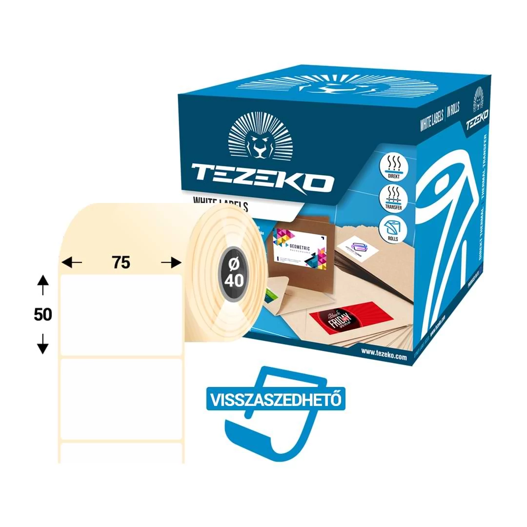 A 75 * 50 mm-es, 1 pályás visszaszedhető direkt termál etikett címke (1200 címke/tekercs) direktermál eljárással nyomtatható anyag, melyhez NEM szükséges festékszalag. A T0750005000-002 cikkszámú tekercses öntapadó etikett címke felhasználása jellemzően száraz körülmények között történik (kültéri hatásoknak nem, vagy csak korlátozottan áll ellen), normál hőmérsékleti tartományban használható.